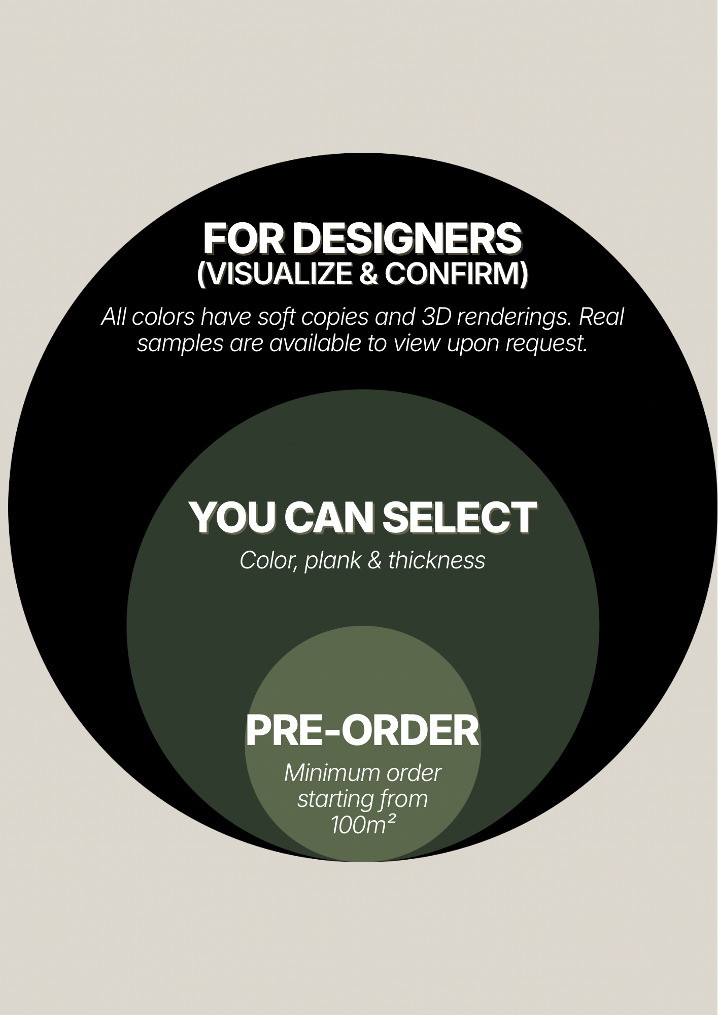 Each order requires a minimum of 100 m² per color and plank, providing greater options and flexibility. We do not keep stock.