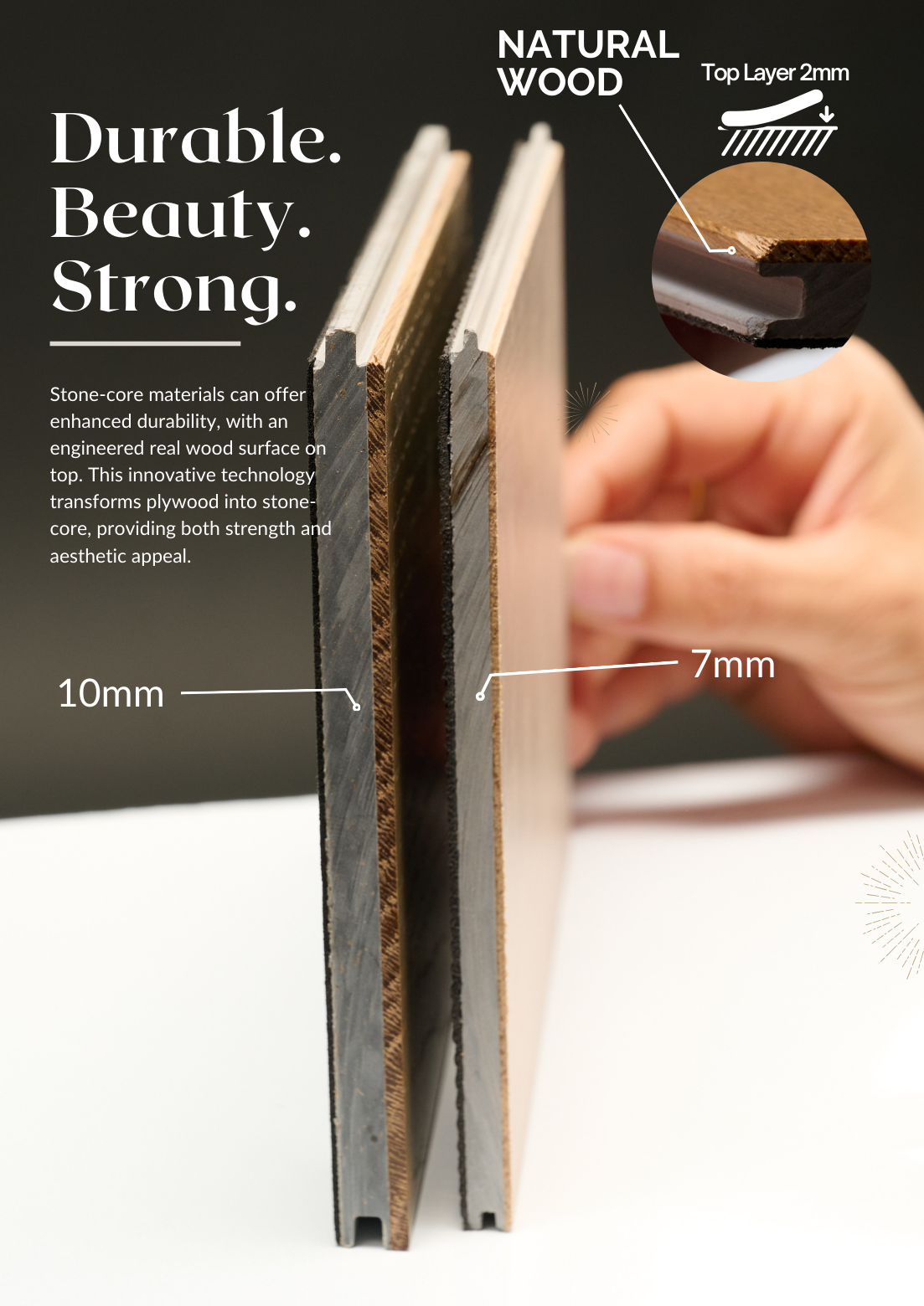 Our Stone-Core base makes flooring more solid, durable, and resistant — while keeping a 2–3mm real oak surface.